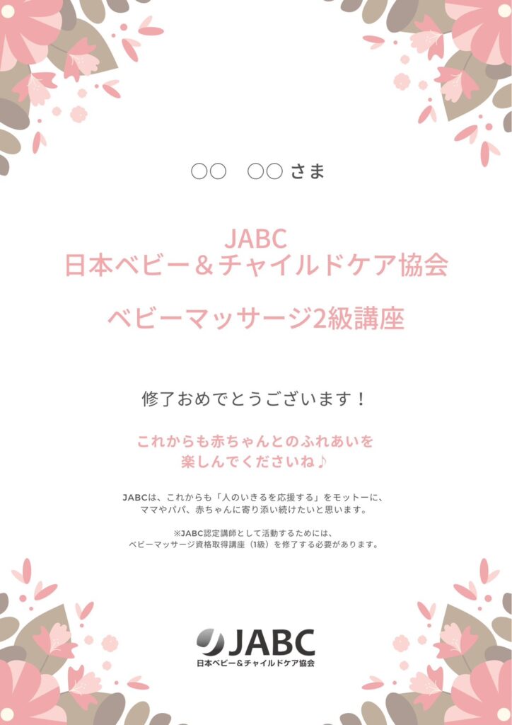 JABC日本ベビー&チャイルドケア協会より終了証が発行されます。「JABC日本ベビー&チャイルドケア協会認定ベビーマッサージ2級講座終了」と名刺やプロフィールに記載できます。